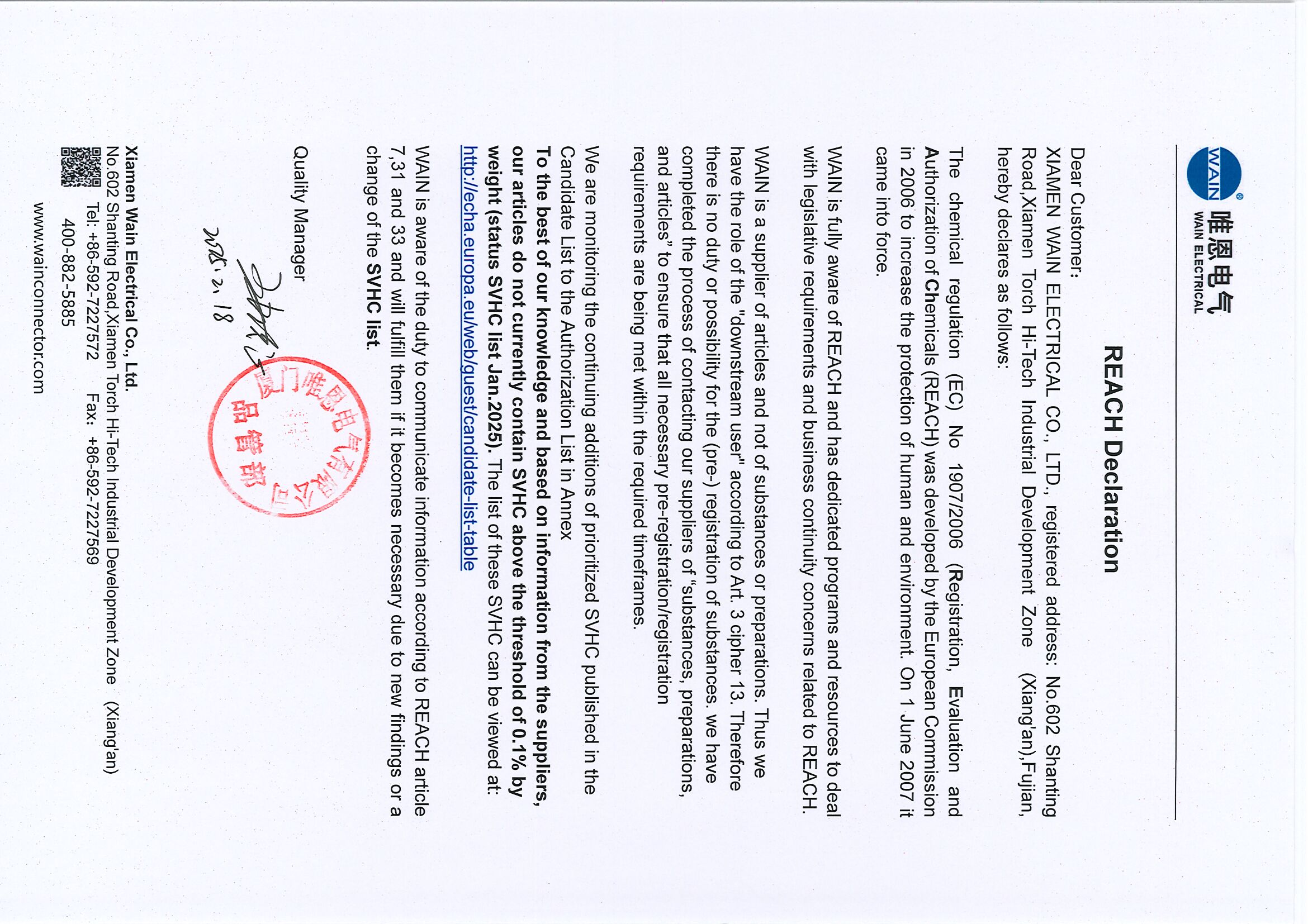 REACH 合規(guī)聲明