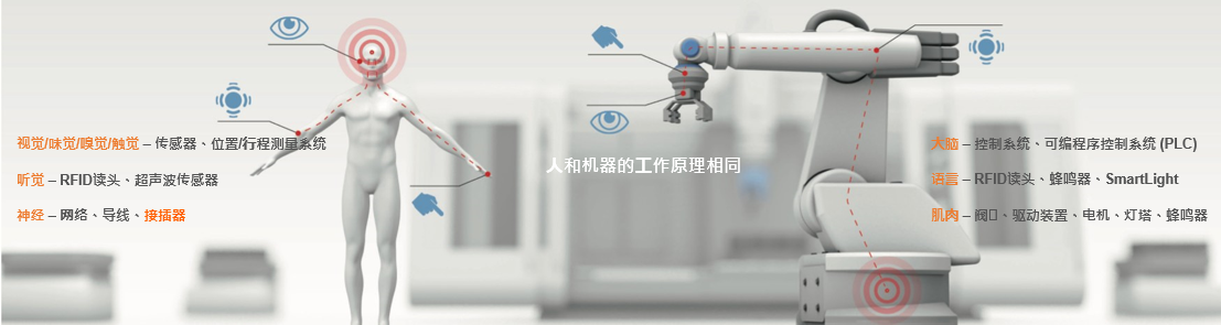 機(jī)器工作起來(lái)(簡(jiǎn)單地說(shuō))象人一樣。如同我們?nèi)祟愅ㄟ^(guò)各個(gè)感覺(jué)器官感知我們的周圍世界,機(jī)器通過(guò)不同的傳感器、設(shè)備和位移測(cè)量系統(tǒng)探測(cè)其周圍環(huán)境。機(jī)器持續(xù)接收信號(hào),將其通過(guò)網(wǎng)絡(luò)發(fā)送至控制系統(tǒng)。控制系統(tǒng)將這些信號(hào)解釋成輸入信號(hào),將其作為輸出信號(hào)發(fā)送至執(zhí)行器。例如發(fā)送至閥門、驅(qū)動(dòng)裝置或燈塔,它們會(huì)觸發(fā)一個(gè)動(dòng)作,使機(jī)器運(yùn)動(dòng)。
