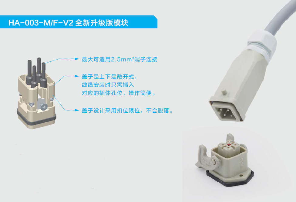創(chuàng)新點:1. 在插體和外殼之間有蓋子阻隔,確保有足夠的爬電距離,保證可靠的電氣性能;2. 頂出線避免了側出線時導線需折成90°再往上;裝線時操作方便;3. 保護蓋子結構可靠,上下推拉都不會脫落;4. 具有編碼銷功能,包含4種編碼方式。
